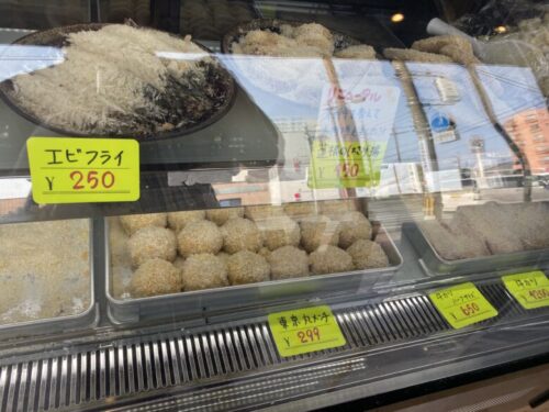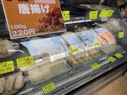 ショーウィンドウの中には揚げる前の総菜が並んでいます。