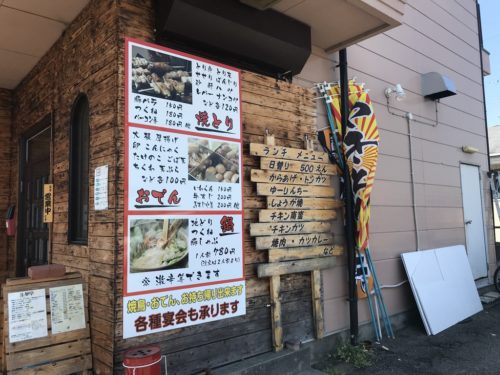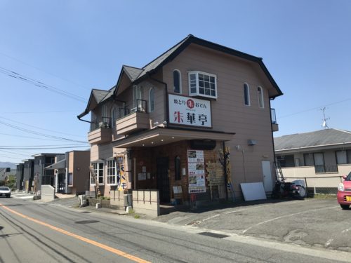 熊本市内から行くと熊本電鉄線堀川駅過ぎて右折「熊本大津線」に入って100メートルほど行ったところにある「朱華亭」。入り口横には居酒屋メニューの看板。