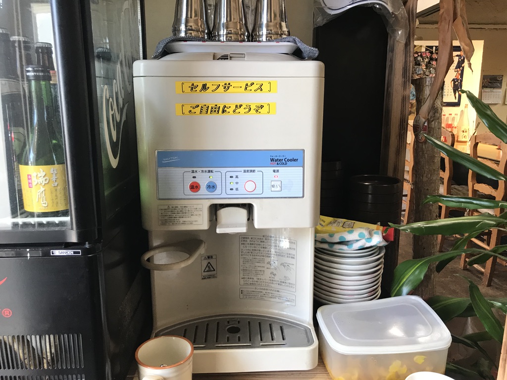 店内入ってすぐ左手に給水機。お水はセルフサービスです。