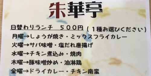 熊本市北区八景水谷、熊本大津線沿いある、居酒屋「朱華亭」。日替わりワンコイン(500円)ランチが、ラインナップ豊富でボリュームたっぷりと聞き、行ってきました。