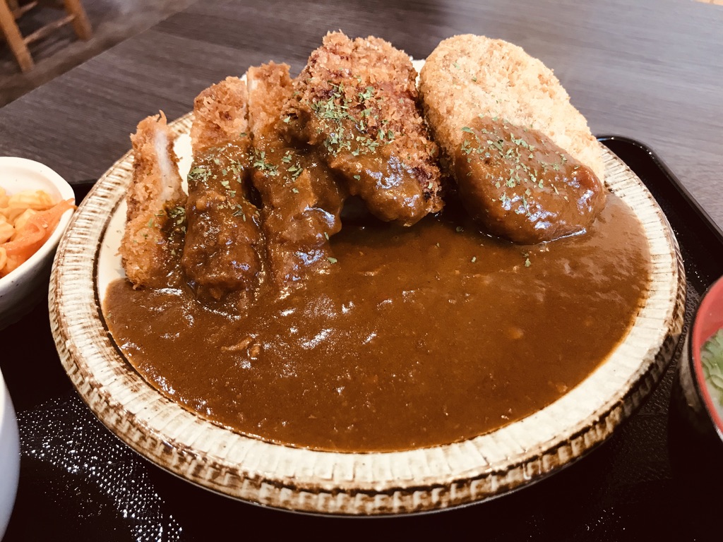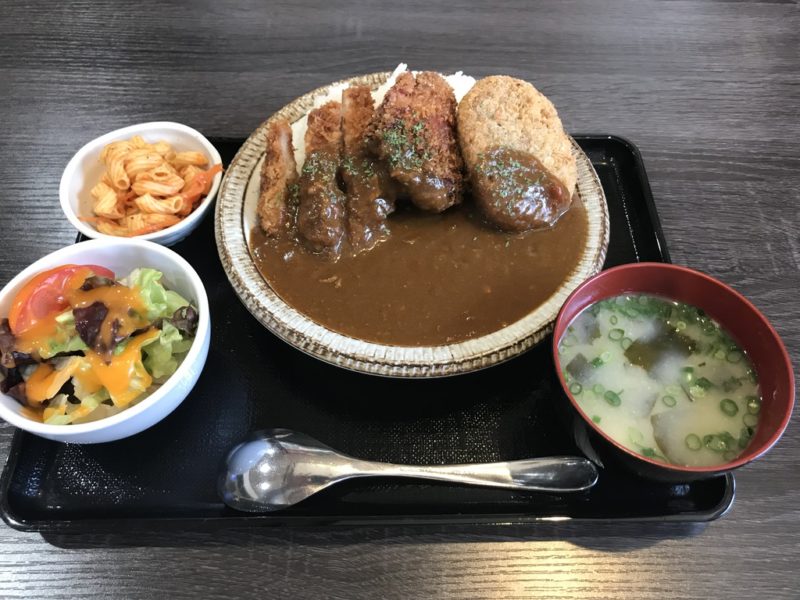 カレーの上にカツ3種類(トンカツ、チキンカツ、メンチカツ)が乗って500円!これ、他のお店だと1000円級のカレーですよ。