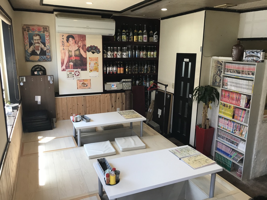 カウンター7席と座敷に4人がけテーブルが3つあります。