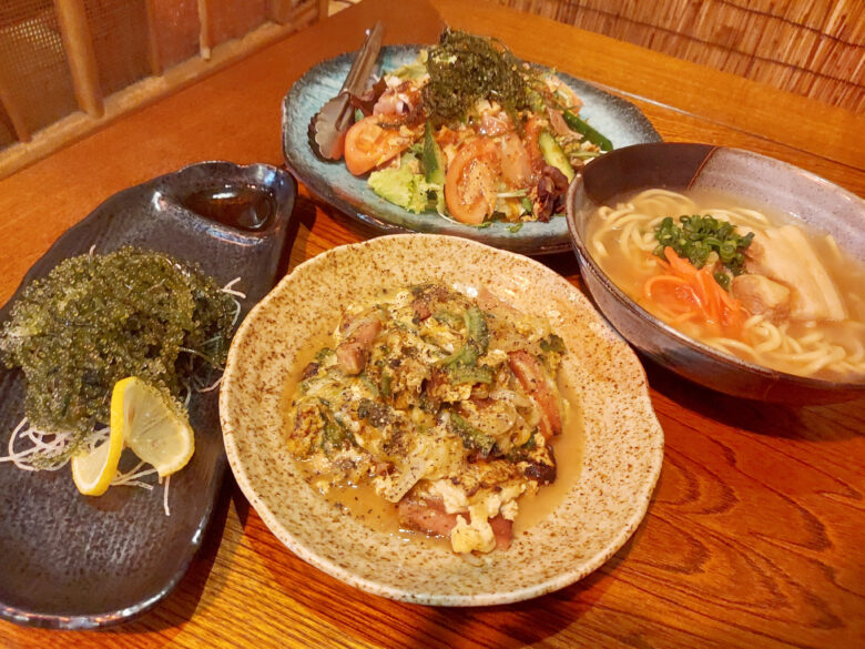 焼き鳥、海ぶどう、サラダ、チーズゴーヤチャンプルー、沖縄そば。