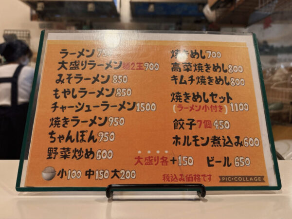 メニューはこちら。ラーメンに、焼きラーメン、ちゃんぽんなどの麺のメニューに、野菜炒めやホルモン煮込みなどの一品料理まで。