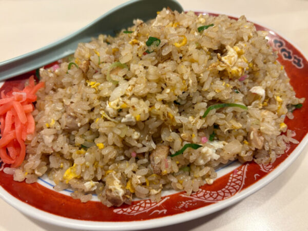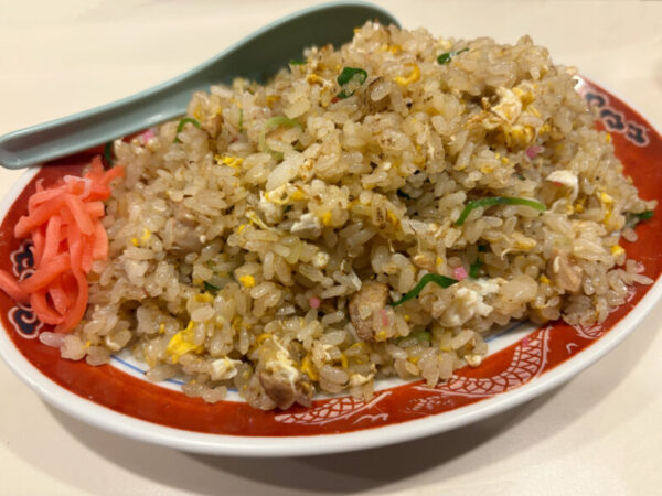 その後に焼きめしの到着。想像以上のボリュームで、平皿にこんもりと盛られています。