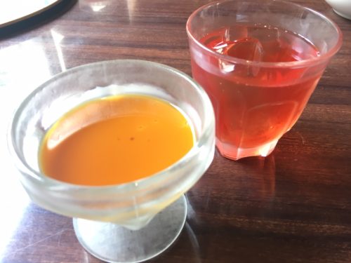 デザートはカスタードプリン。選べるドリンクは、桃とザクロの健康ドリンクにしてみました。