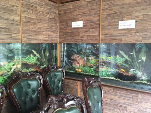 入口から入るとすぐ、人気店ならではの待合席が設置されていましたが、そこには水槽が…!