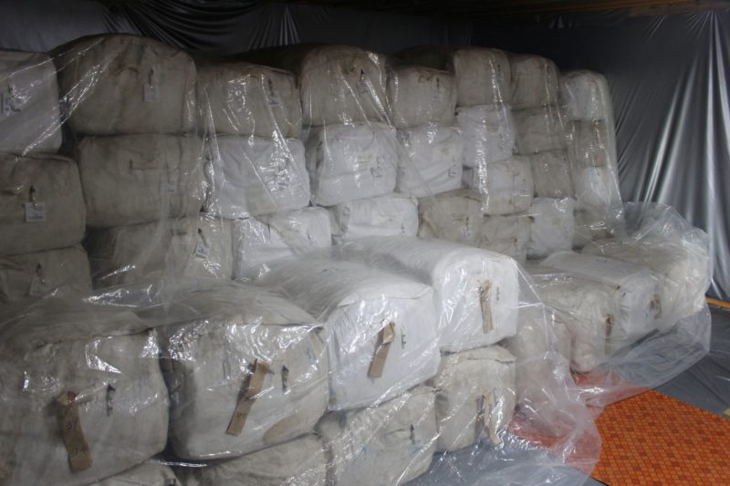 収穫した葉たばこはこんな感じでシートに包まれ倉庫に運び込まれます。