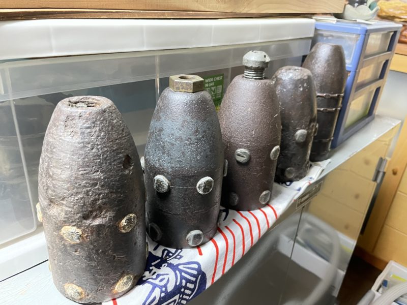 採掘された不発弾。持たせてもらいましたが、ずっしりと重く片手では無理。こんなものが飛んできてたなんて…。