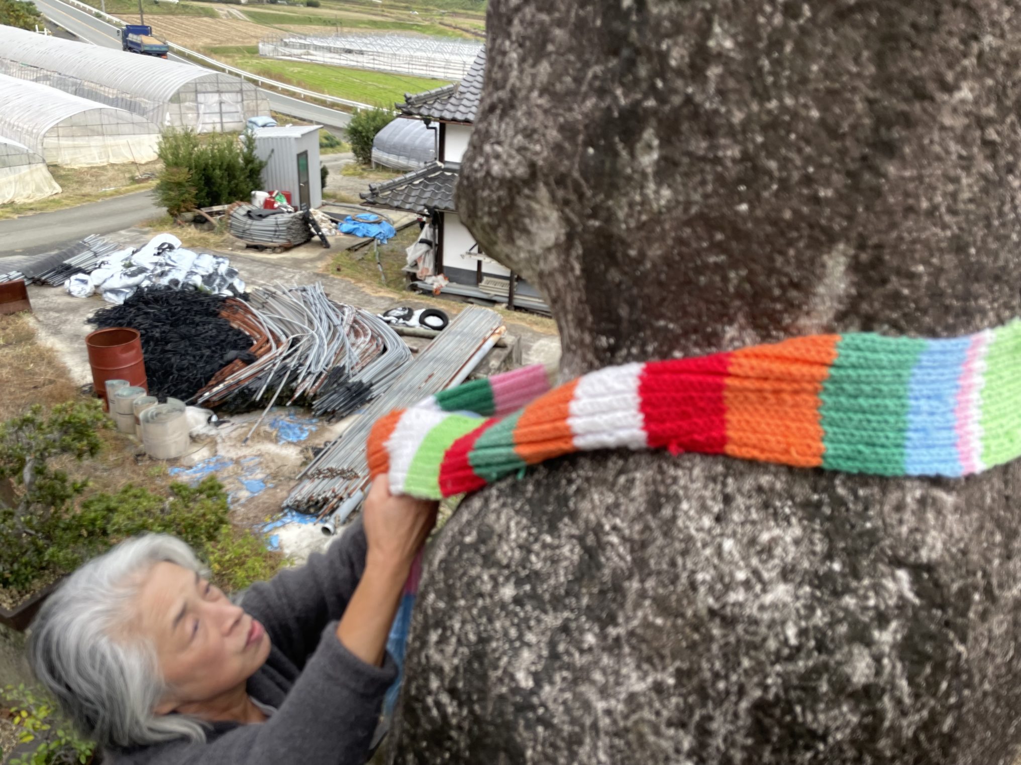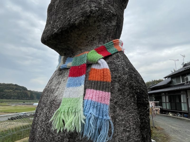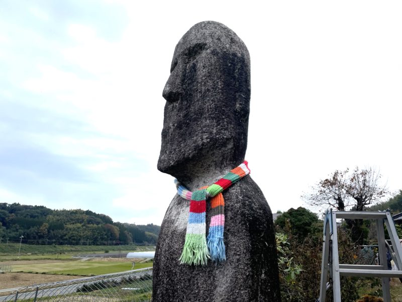 今からこのモアイ像にマフラーを巻きます。