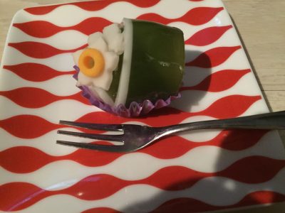 「水仙」(110円)白あんに抹茶のゼリーでくるんでいます。白あんと抹茶の風味が絶品!お皿に乗せると、より見た目が引き立ちます。