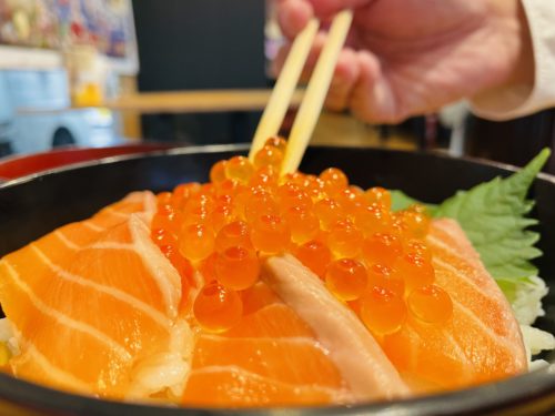 ランチメニューはこちら。迷いに迷って名物の「海鮮丼」と「サーモンいくら丼」と「にぎり盛」を注文いたしました。