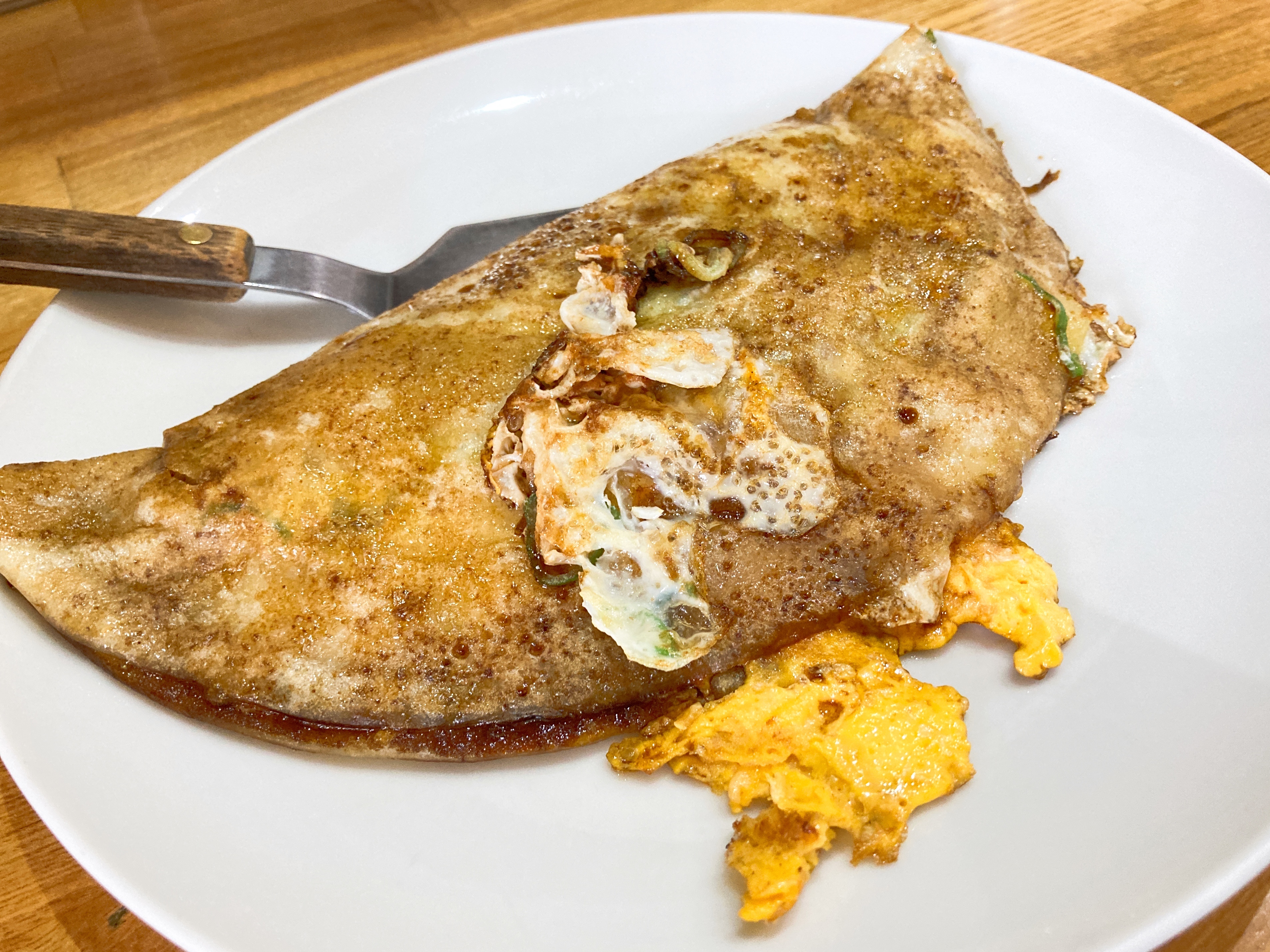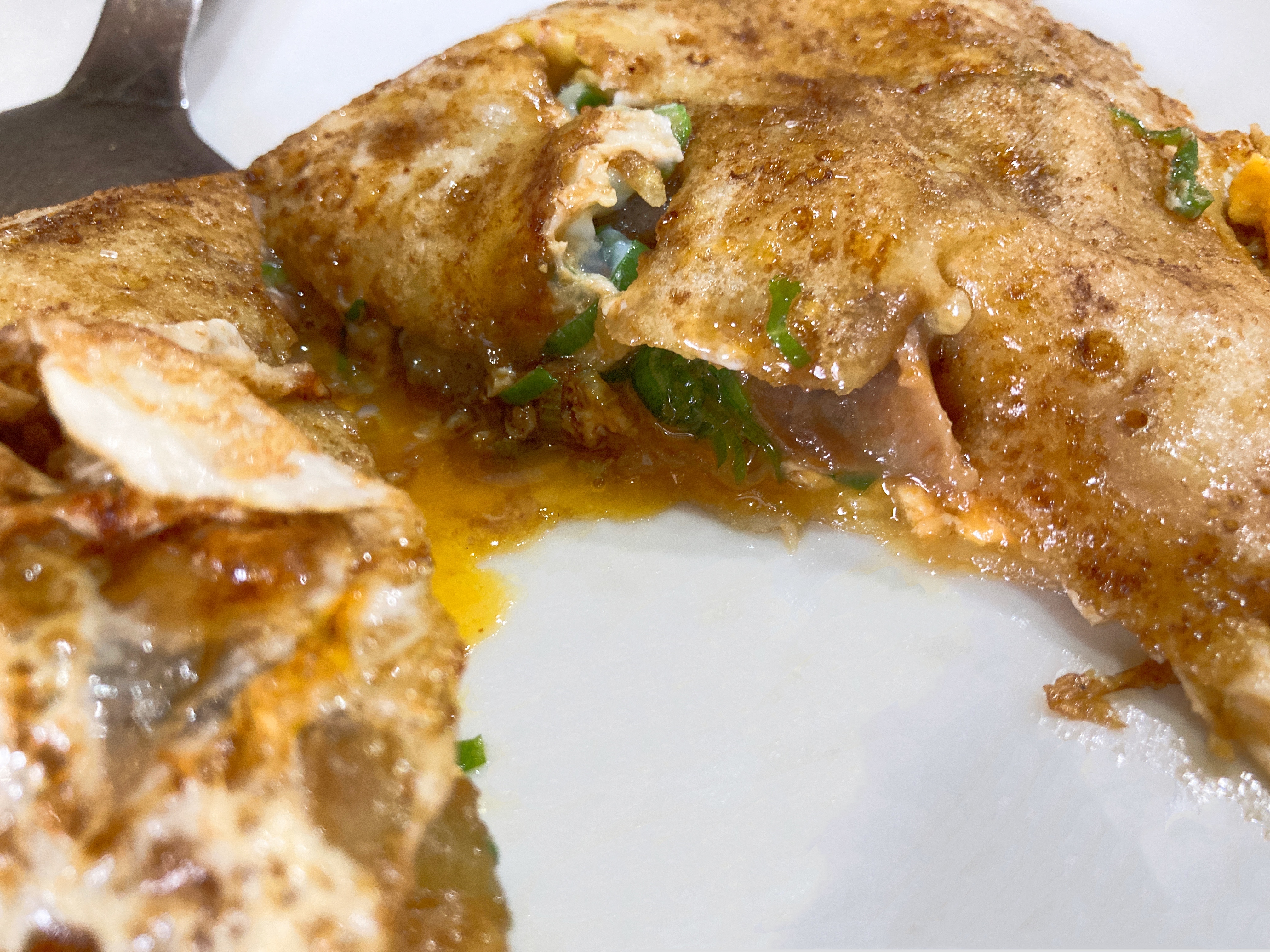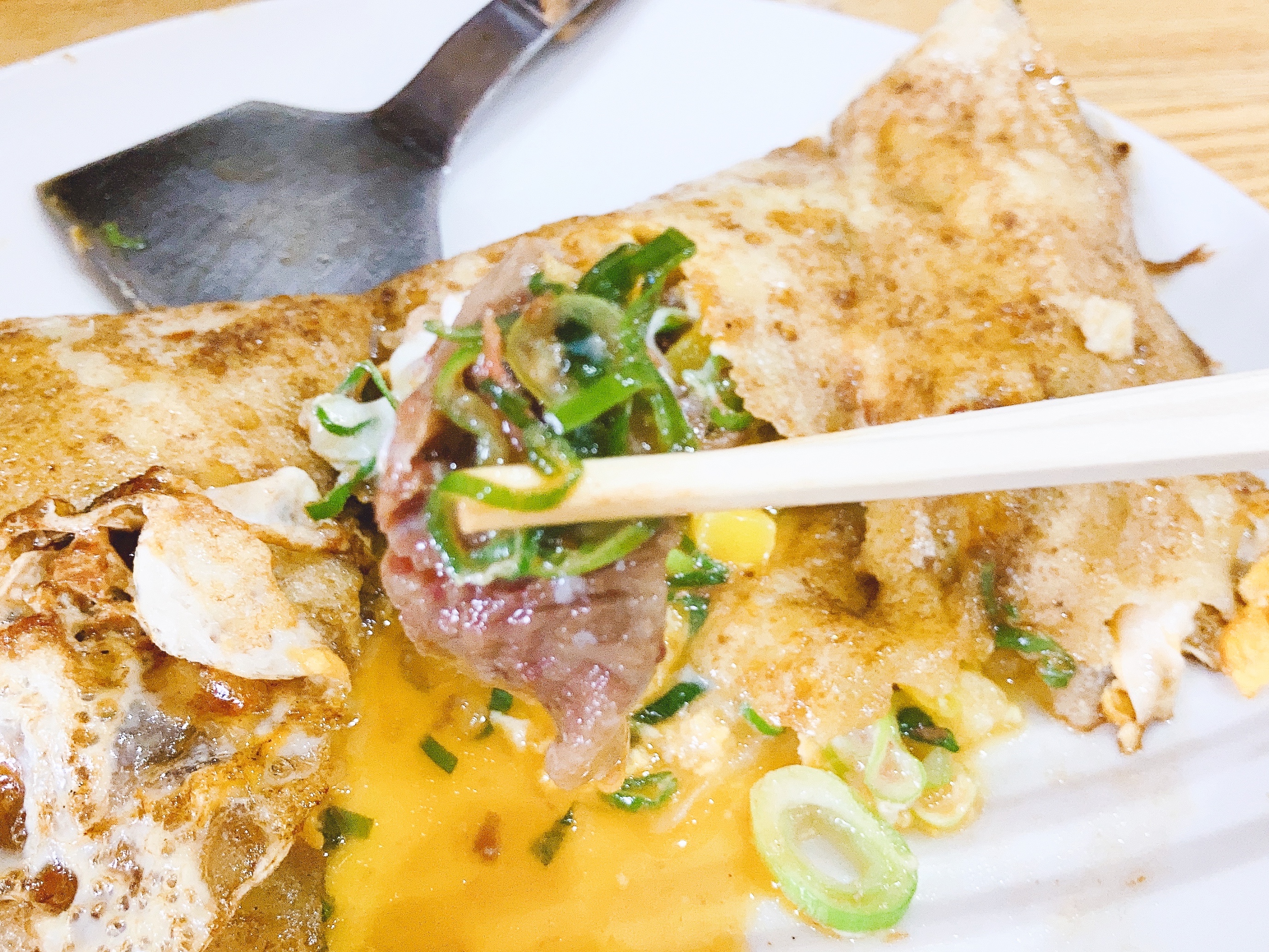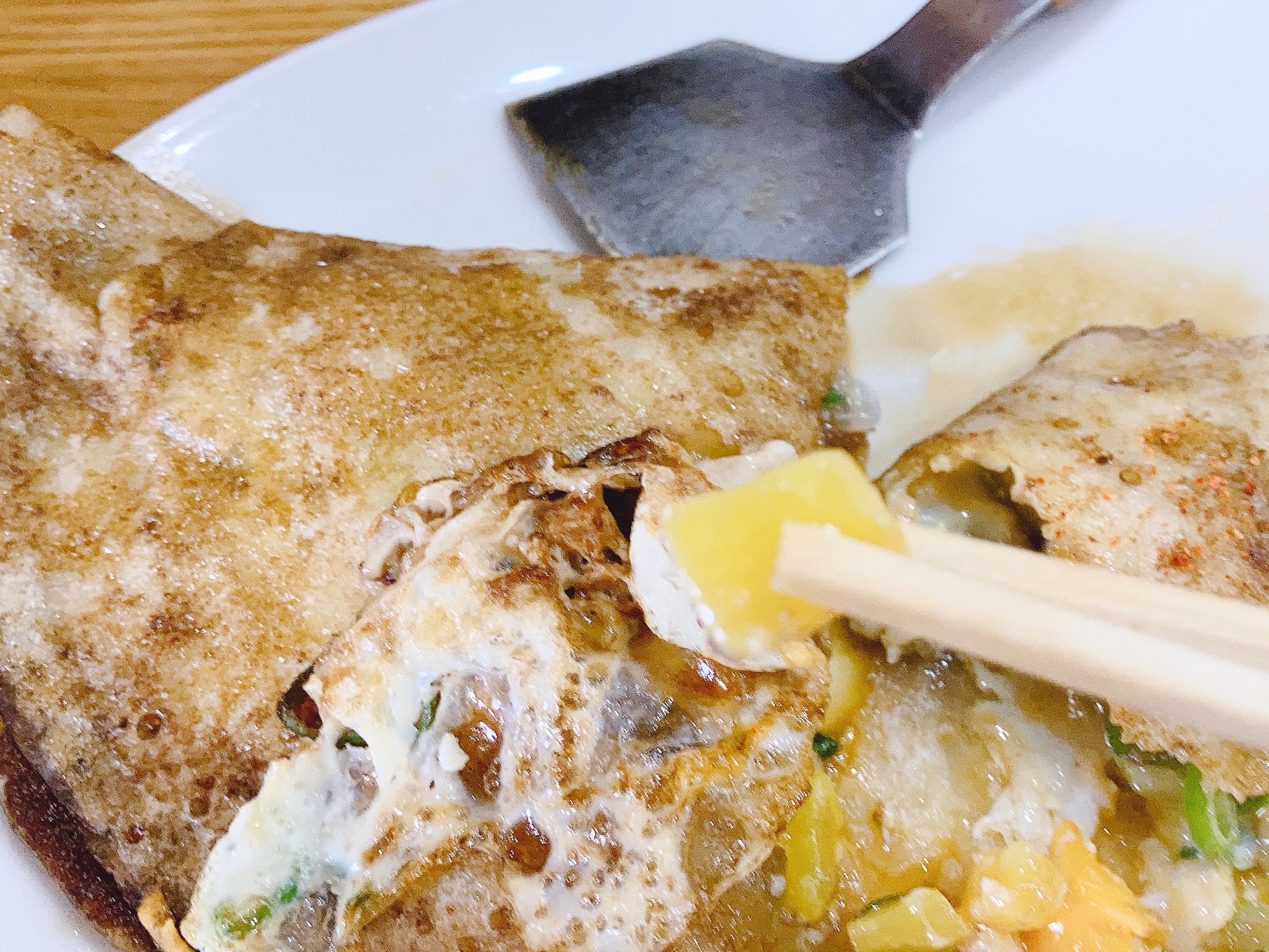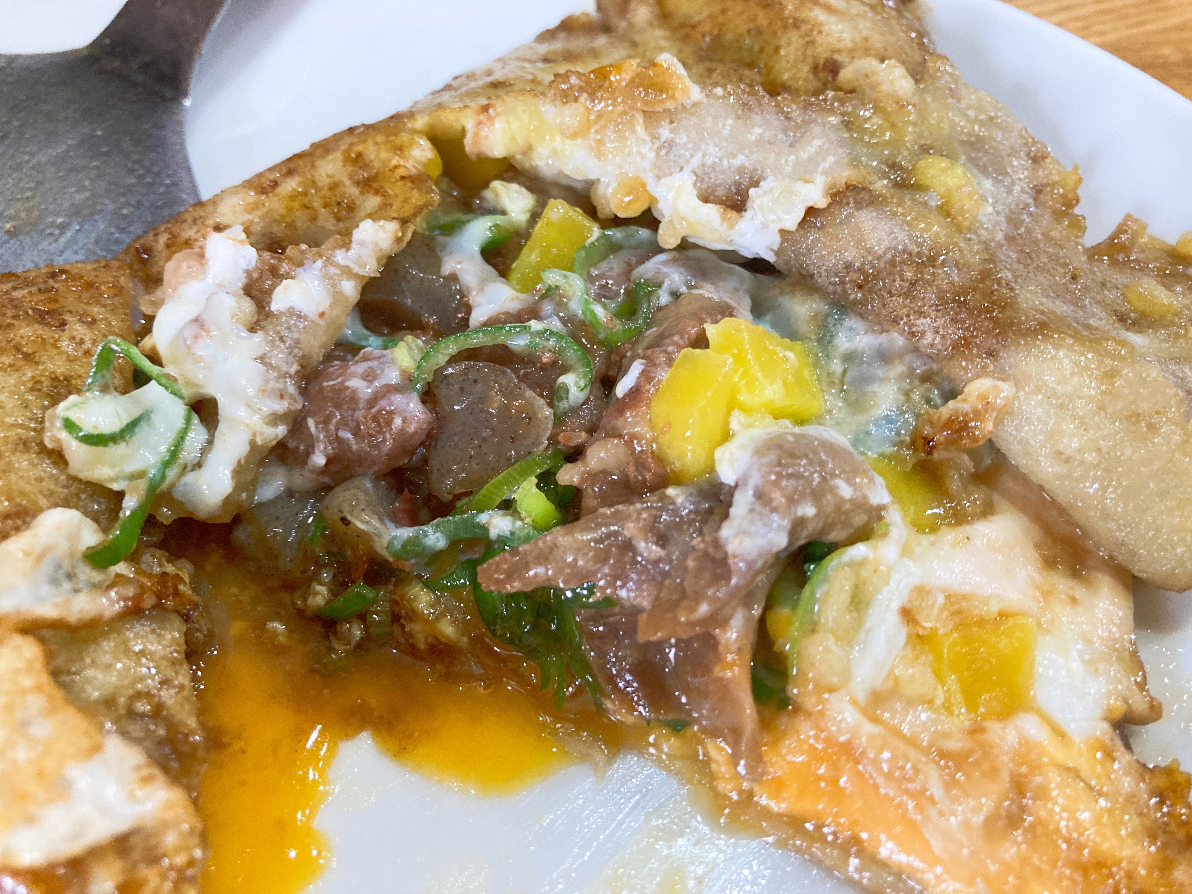 まずは外側から。もっちもちで美味しい!お好み焼なんですけど、バターが使ってあるのでちょっと違う印象なんです。何に近いかな…ホットケーキ⁉甘くないホットケーキ?!