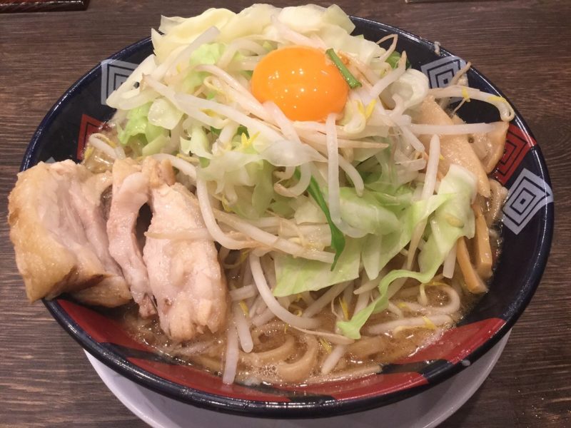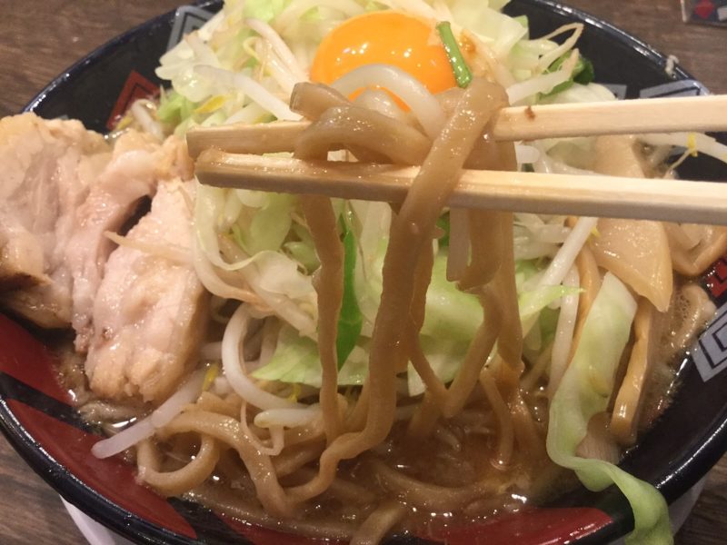 極太麺の上にもやしとキャベツが山ほど乗っています。これだけ野菜が盛ってあってもヘルシー感を感じないボリューム。それでも「野菜たくさんだからこってこてをがっつり食べてもOK」と自分に言い訳できます。