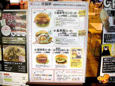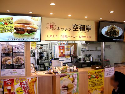 阿蘇くまもと空港のフードコート奥にある、地産地消食材を扱ったハンバーガーや焼きそばを提供する「キッチン空福亭」。