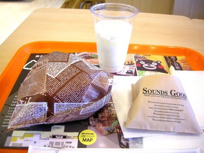 ハンバーガーの包みを開いてみますと、バーガーから勢いよく突き出た二本の春巻き!