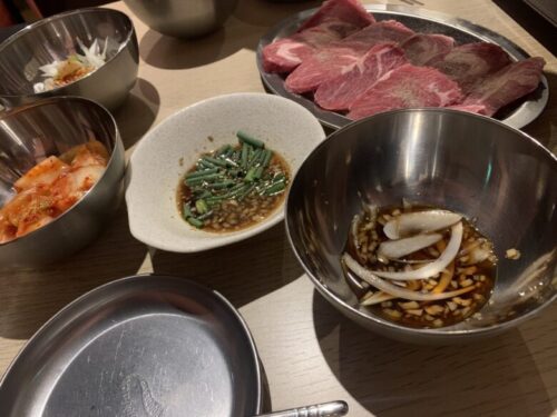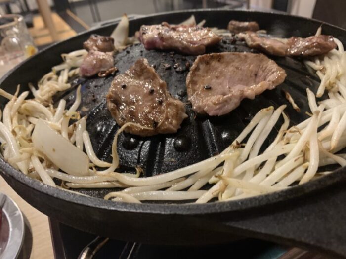 キムチやネギもセットに付いてくる他、カルメギサルとジンギスカンとでお肉のたれも違うというこだわりっぷり。聞けばサムギョプサル(豚ばら肉の焼肉)もタレが違うのだとか。