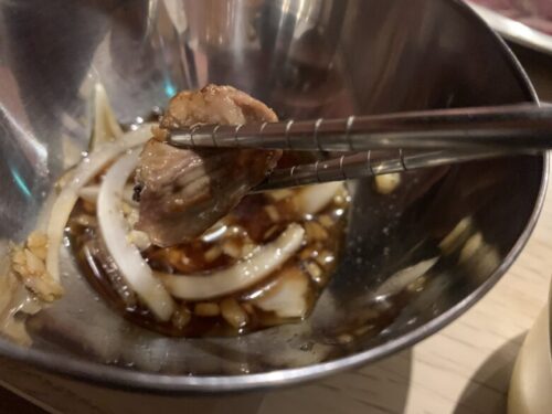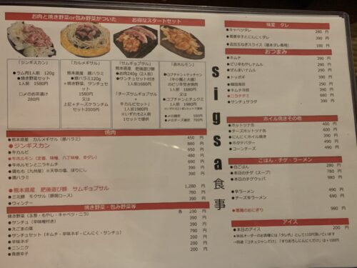 今回は同行者もいたので、ジンギスカンの前に「カルメギサル」というセットも頼んでみましょう。聞きなれない単語ですが、メニューの説明を見ると要は「熊本県産 豚ハラミ」の焼肉みたいですね。