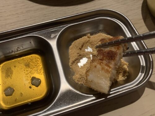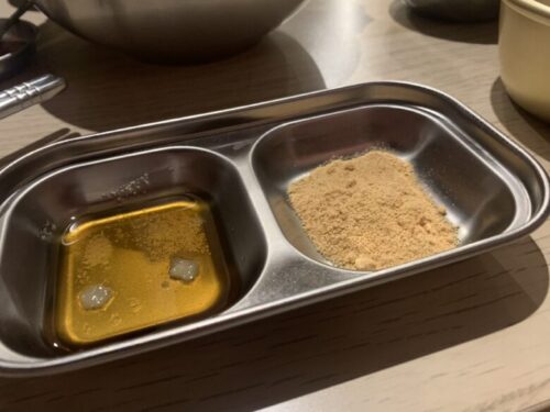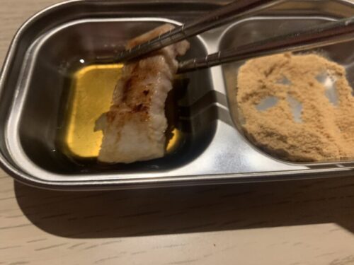 こちらが噂のサムギョプサルのタレ。塩だれと…なんと、きなこ。どんな味なんでしょう?!