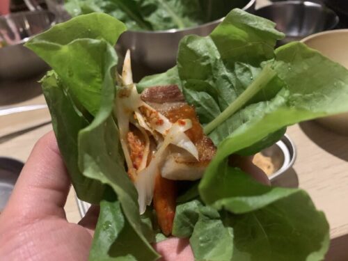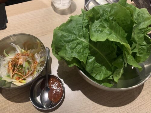 たれを使わずに、サンチュで包む食べ方も。野菜が沢山食べられてヘルシー!
