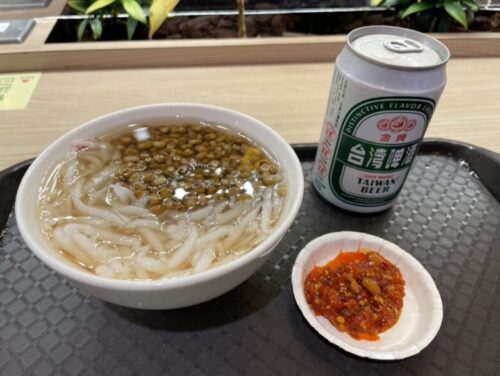 ビールと「豆と米粉麺のうどん」と書いてあった食べ物を注文しました。このうどんが