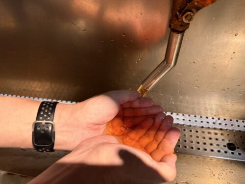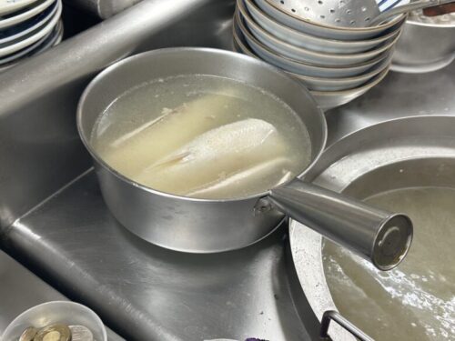水じゃなくてレモン入りの紅茶で洗います。なぜ紅茶なのかと聞いたところ「匂いが取れるから」だそうです。刺激的!