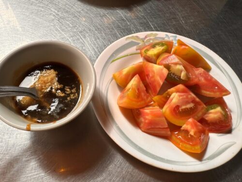 トマトをタレ(たっぷり生姜入りみたらし醤油)につけて食べるメニューでした。