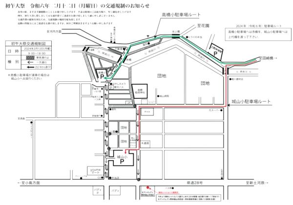 毎年、多くの方で賑わう初午大祭。城山小学校・高橋小学校・三和中学校の3ヶ所に臨時駐車場があります。
