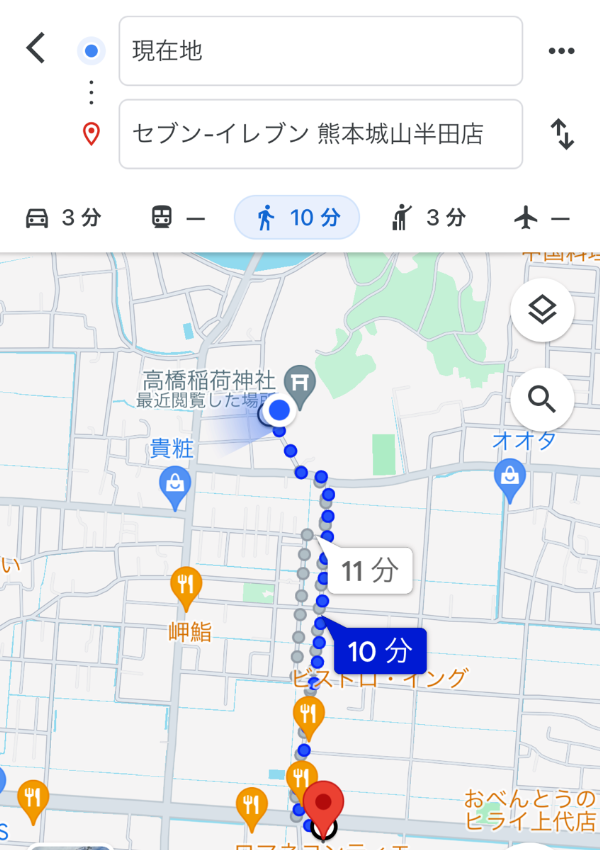 高橋稲荷神社とセブンイレブン城山半田店の距離は、徒歩で約10分。さほど遠くない距離です。