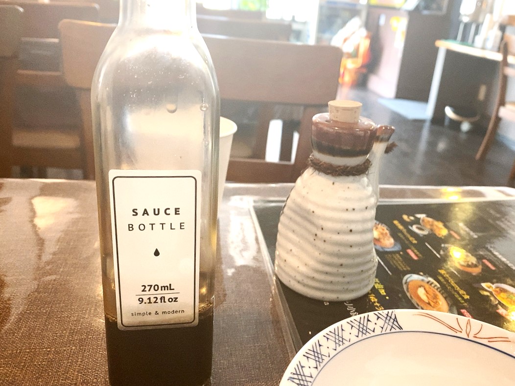 ちなみに、ソースのボトルがあるので味変にどうぞ。甘めながらあっさりしているサラサラのソースです。これを掛けるとあら不思議。急に既視感が。これ、よく知っているカツ丼!