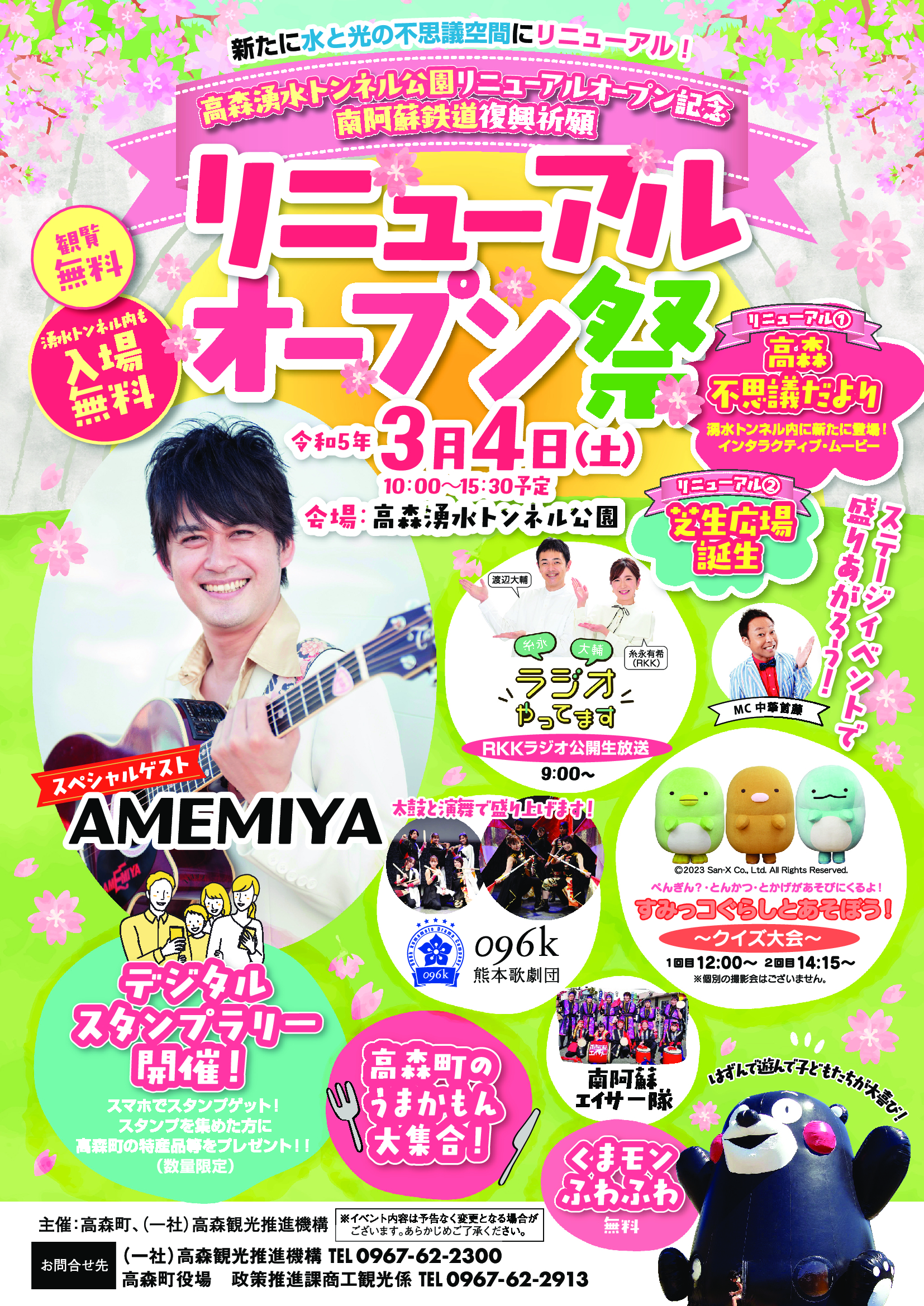 人気お笑い芸人AMEMIYAさんの爆笑ライブや、すみっコぐらしのクイズ大会、グルメなど盛りだくさん。当日行われるデジタルスタンプラリーのガラポン抽選会では豪華賞品(あか牛1キロ)が当たるチャンスも!