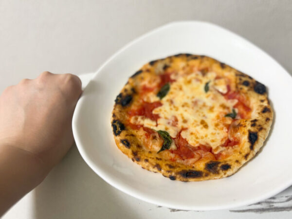 驚きなのが1枚300円ということ。専門店のピザに比べると小ぶりですが、拳と比較するとこんな感じ。1人で食べるには十分な大きさです。