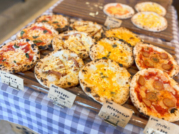 宝屋パンの人気メニューであるピザ。マルゲリータに加えて、テリヤキチキン、クワトロフォルマッジ、ペパロニなど種類も豊富です。