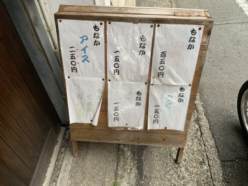 店頭の看板では色が薄くなってちょっとわかりにくいですが「もなかアイス250円」ははっきりわかります。早速お邪魔してみましょう!