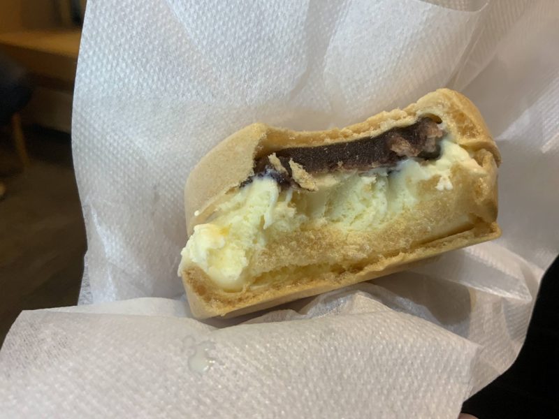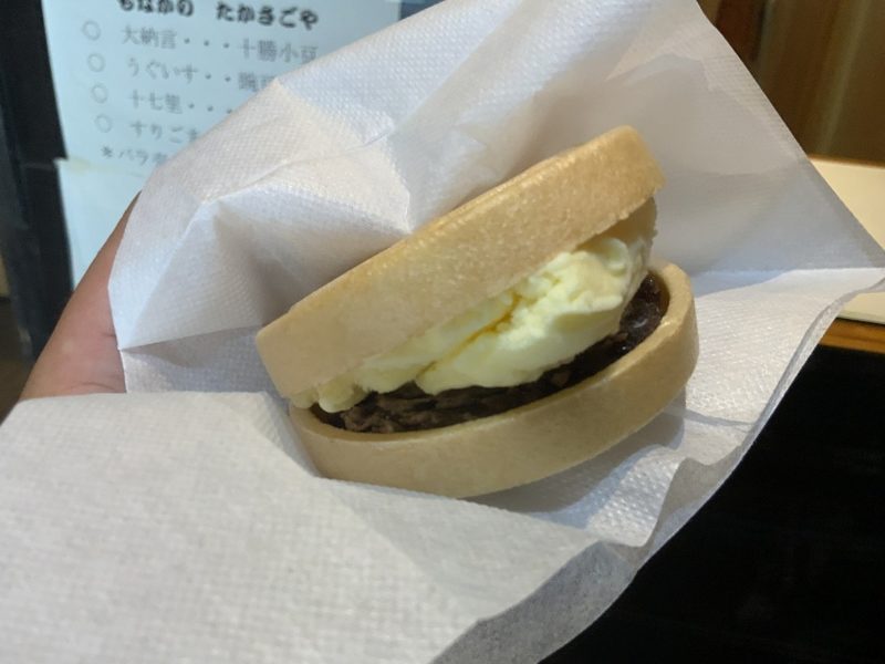 最中の皮に大納言の餡とバニラアイスがたっぷり詰まっています。サクサクの皮の食感と、混ざりあった2種類の違った甘さが絶妙でめっちゃ美味しい。