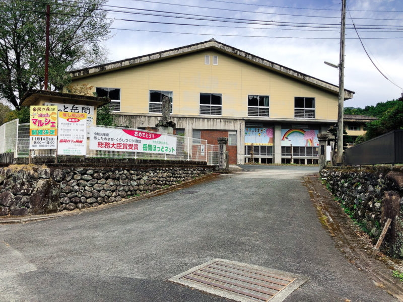 ということで、旧岳間小学校にやってきました!2013年に廃校になった岳間小学校ですが、校門前に弾幕や看板が掲げられています。現在は、「ほっと岳間」という名前でイベント等を行っているそう。