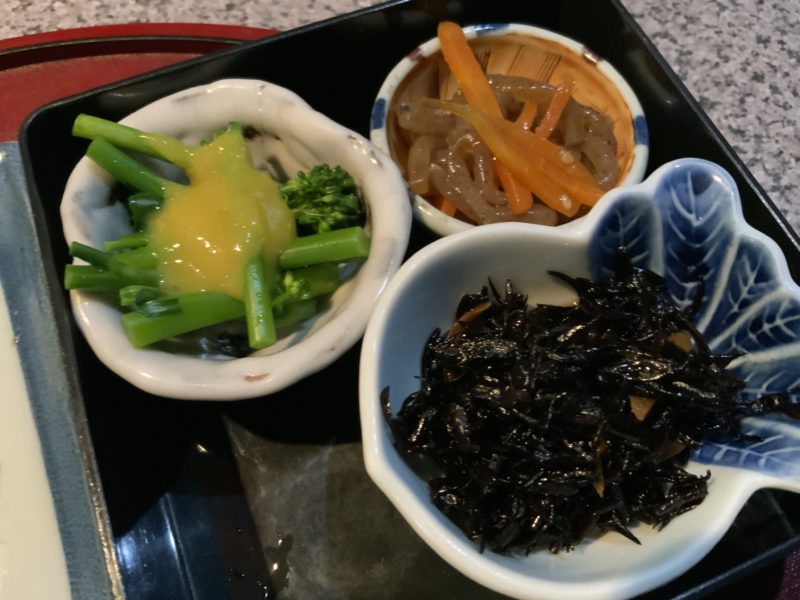 この日の小鉢はこんにゃくのきんぴらと、ひじき、スティックセニョールの酢味噌。