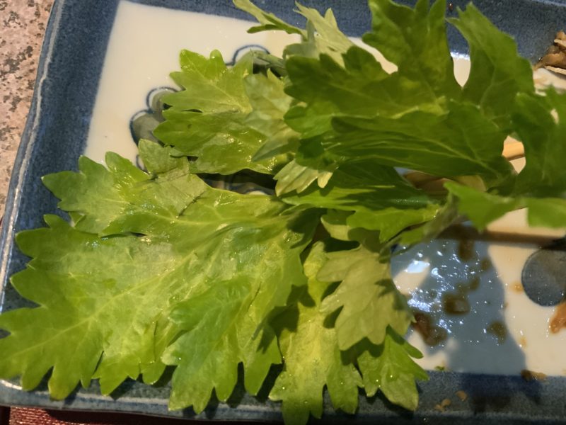 煮魚の下にあった葉物、多分、菊の葉。上品なお料理にはなかなか縁がないので知識不足です。