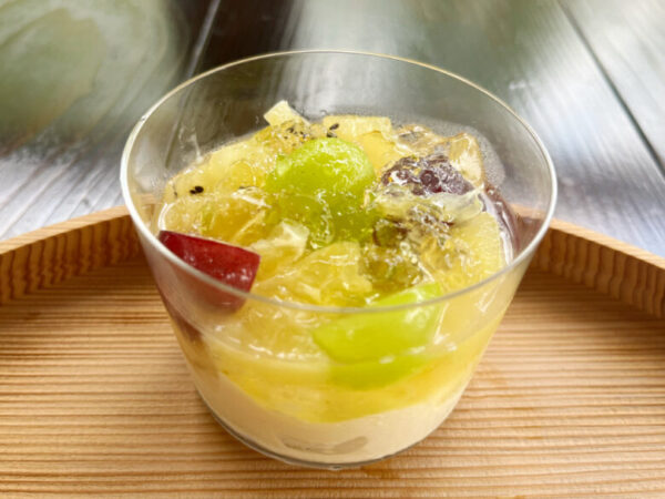 甘味は、豆乳のパンナコッタ。なめらかな口当たりで、ほのかに豆乳のコクを感じます。上に掛かっているフルーツとジュレがさっぱり。爽やかな後味です。