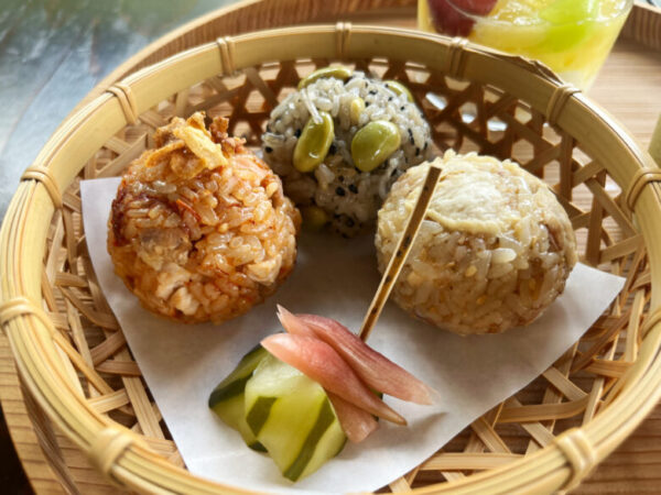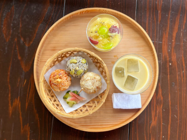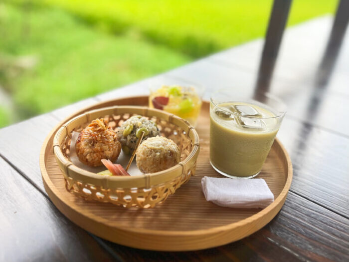 おこわに使われるお米は、目の前の田んぼで採れたものと阿蘇のもち米。甘味には近くお豆腐屋の豆乳、ドリンクには南小国の湧水というようなこだわりたっぷり。