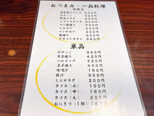 夜は、定食以外に一品料理もあり。お酒と一緒に楽しむのも良いですね。