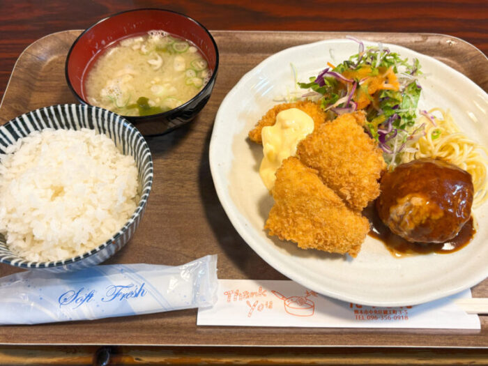 これだけでも魚フライ定食な成り立つくらい十分な量。さらに、それに加えてハンバーグがついているといボリュームたっぷりの一食です。
