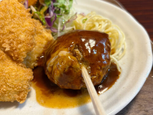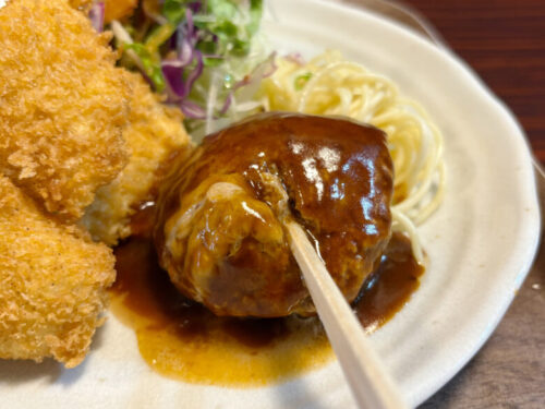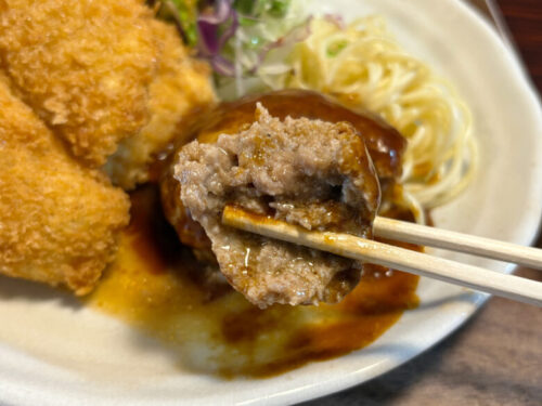 ハンバーグは柔らかいタイプ。たっぷりの肉汁と濃いめのソースと合わせて食べると最高。