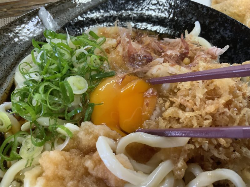 たっぷりの大根おろしに天かす、ねぎ、削り節、そして生卵が乗っています。