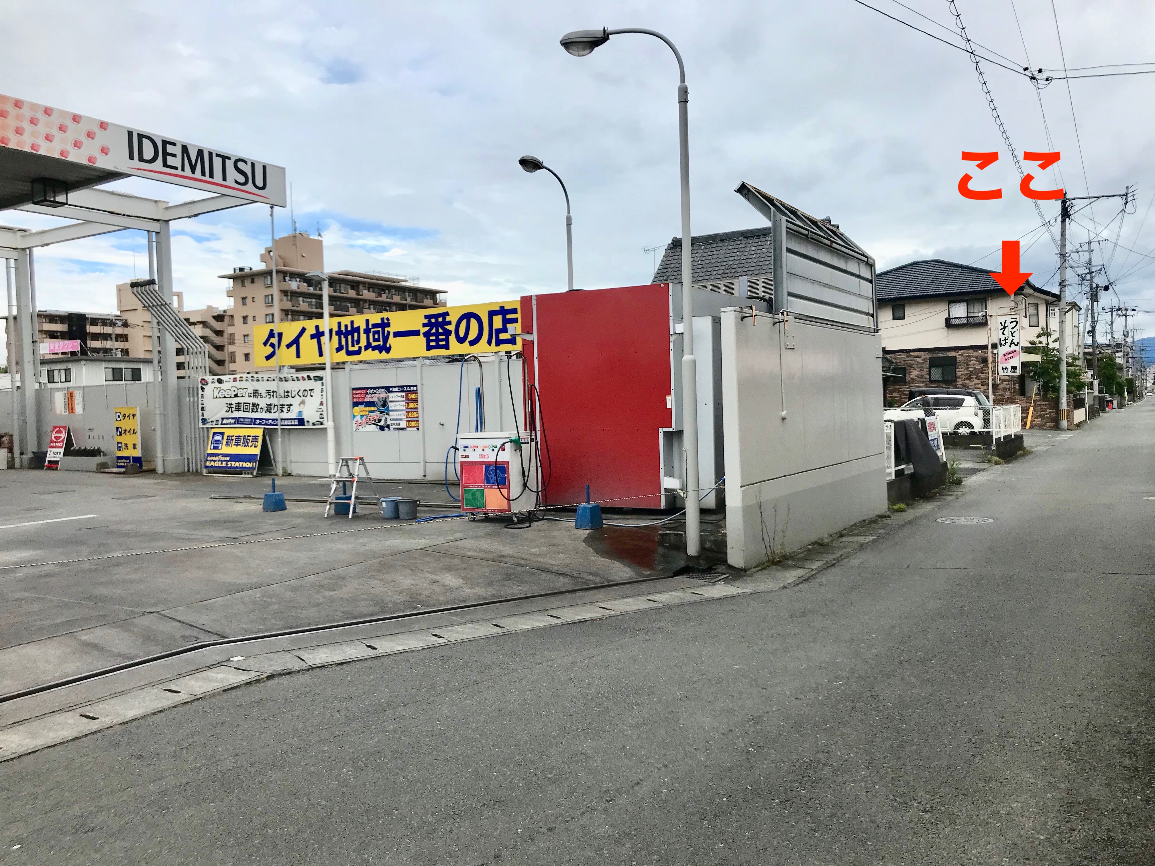 国体道路の東光石油(出光)の角を曲がると「竹屋うどん」