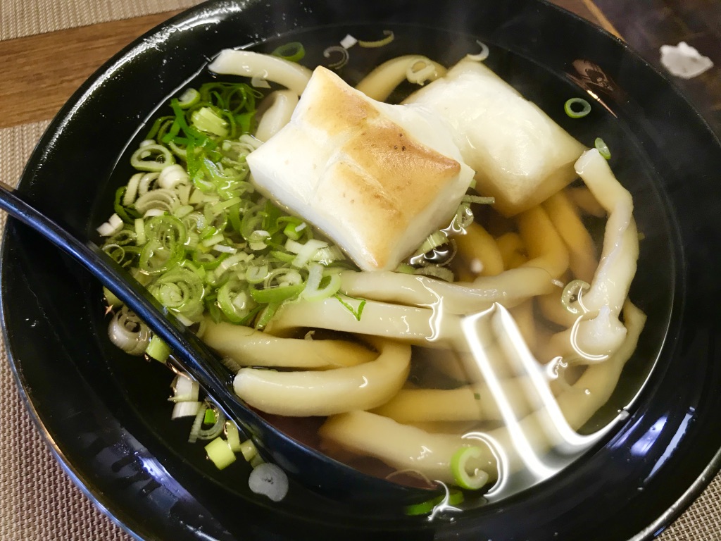 焼餅がうどんの上に乗ってる「力うどん」を注文しました。炭水化物ON炭水化物です。