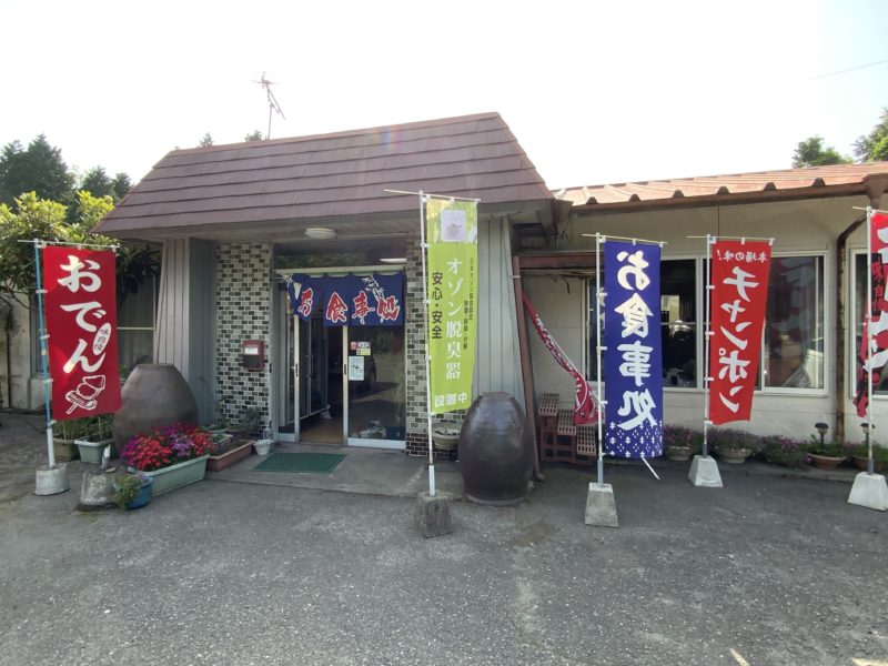 昔ながらの趣のある建物。のぼり旗には「ラーメン」「ちゃんぽん」「おでん」と美味しそうなものばかり。