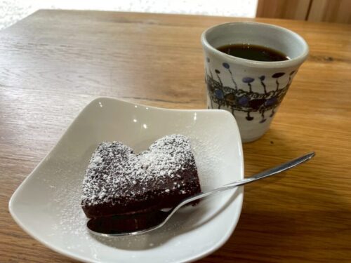 深煎りの珈琲「吉無田高原野焼きブレンド」とともにいただきましたが、丁寧に淹れられるドリップ珈琲と手作りデザートがセットで500円というのも、ありがたい限りです。