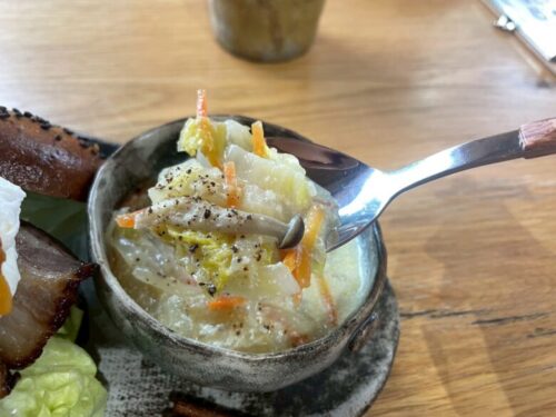 こちらの野菜たっぷりの食べるスープは、七滝で作られた七滝みそと豆乳ベースの、優しくてほっとする味。