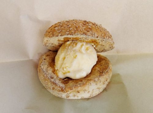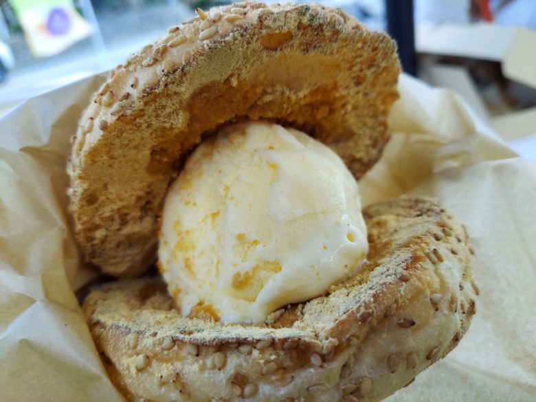 揚げパン風生地のバンズの中に、バニラアイスクリームが鎮座しています!